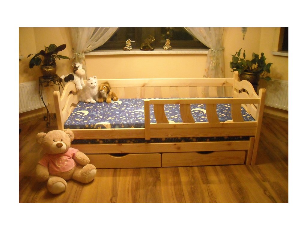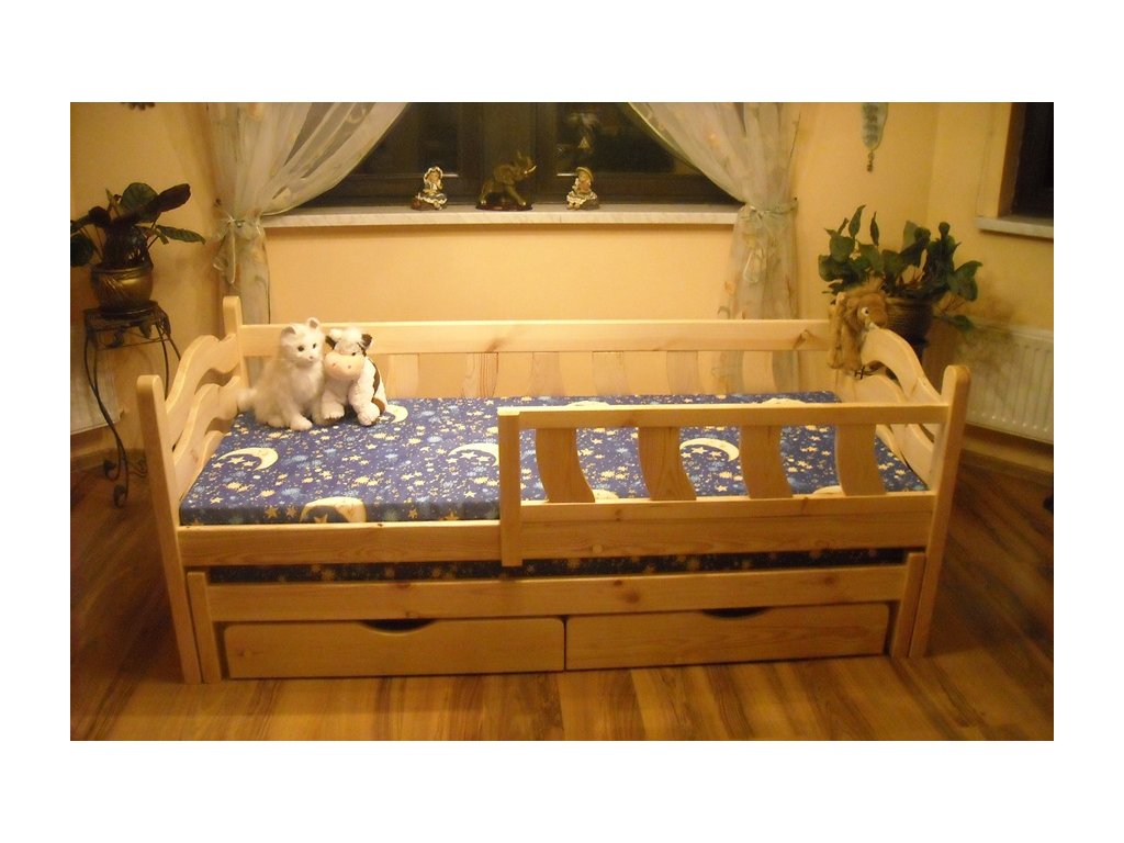 Praktická a stylová dětská postel z borovicového masivu s výsuvnou přistýlkou a šuplíky – ideální řešení pro sourozence, hosty nebo přespávání kamarádů.