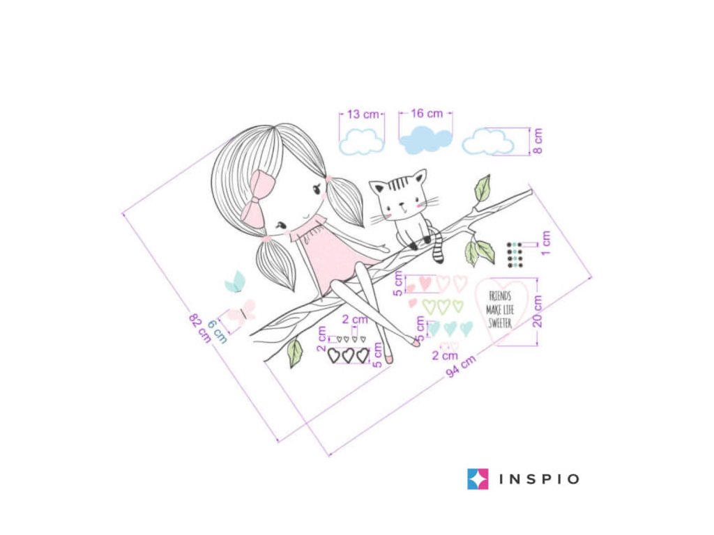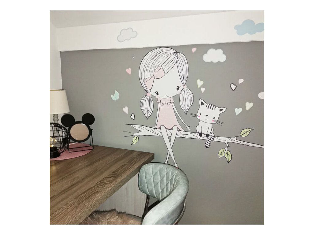 Dětské samolepky na zeď - INSPIO víla na větvi s kočičkou v růžovém provedení