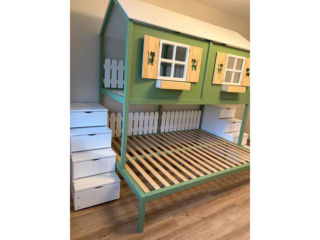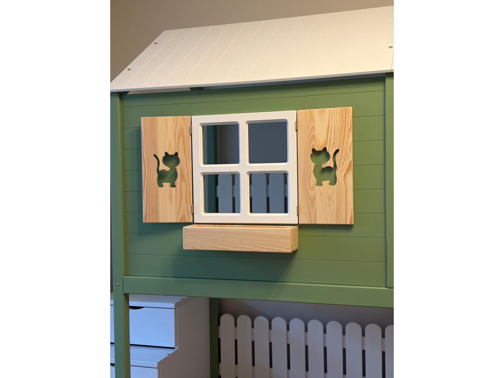 Materiál na výrobu postele je borovicové dřevo, okna, střecha a zábrana je MDF deska.