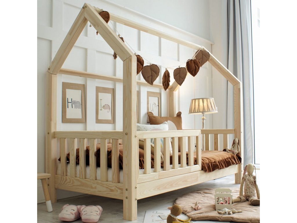 Domečková postel Bianco je vyrobena z lepeného borovicového dřeva 1.třídy, jenž je mnohem odolnější než klasický masiv, nepraská a nemá viditelné suky.