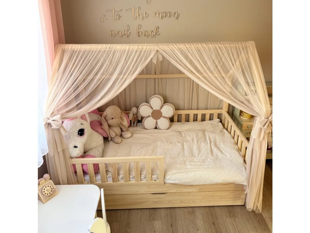 Domečková postel je vyrobena z lepeného borovicového dřeva 1.třídy, jenž je mnohem odolnější než klasický masiv, nepraská a nemá viditelné suky. Všechny části postele jsou zaoblené, čímž se zvyšuje její celková bezpečnost. Postel je vybavena přední zábranou. Tato zábrana je odnímatelná, v případě potřeby ji tak lze snadno demontovat. Zábrana je univerzální.