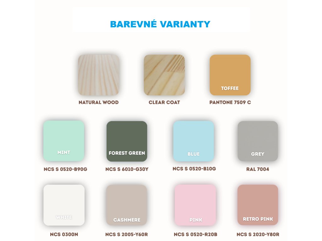 Postele jsou lakovány (kromě volby přírodního nelakovaného dřeva) vodou ředitelnými barvami bez zápachu a ekologickými barvami.
