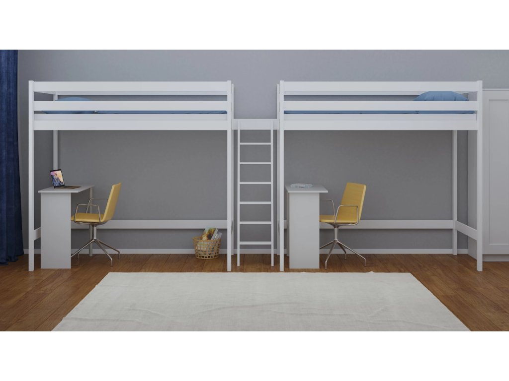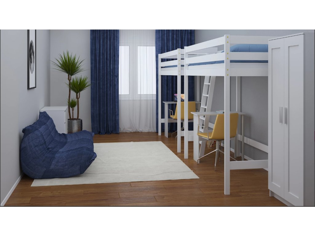 Tato duo vyvýšená postel je perfektní řešení pro sourozence v menším pokoji. Horní část nabízí pevný spací prostor, zatímco spodní část můžete využít jako psací stůl nebo malý gauč s posezením – ideální místo pro hraní, odpočinek nebo studium.