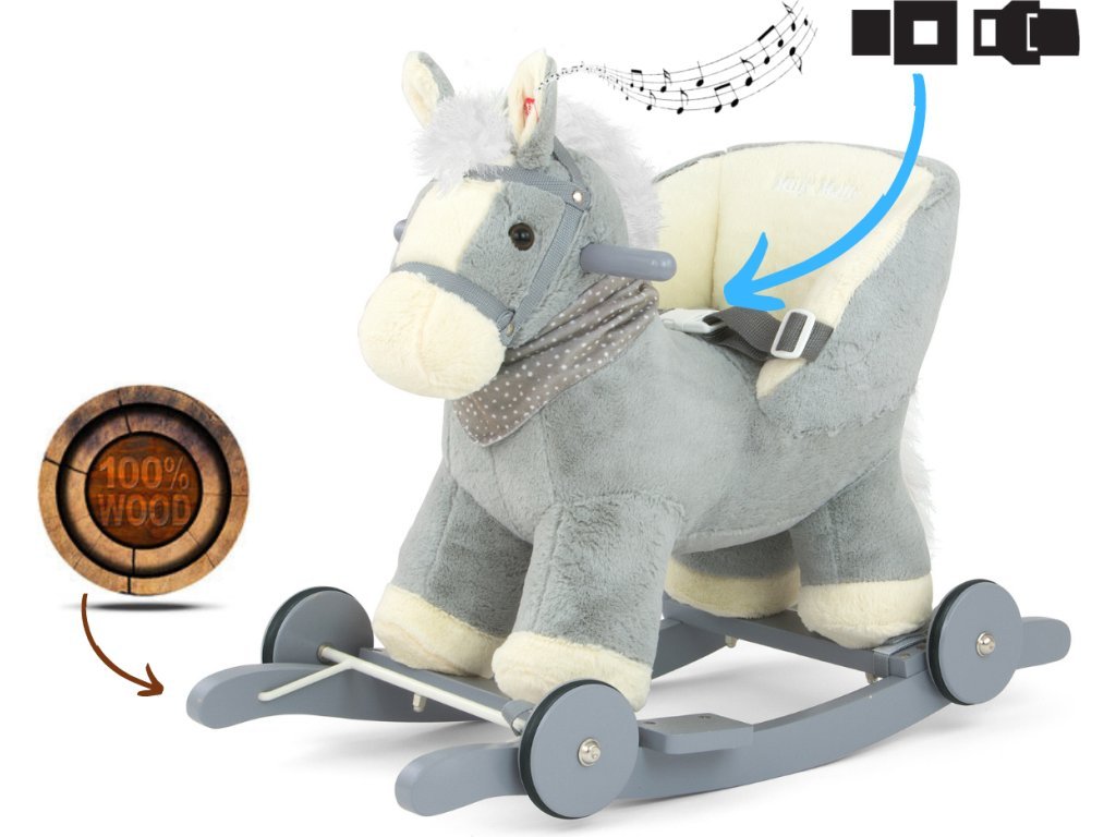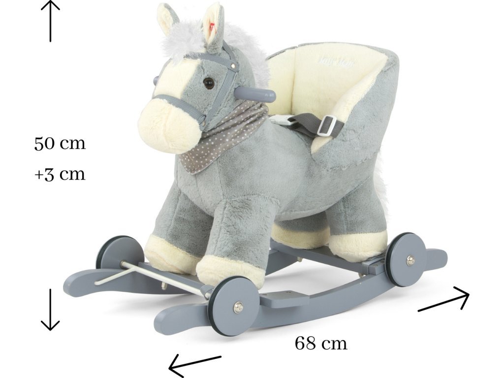 Měkoučký houpací koník Polly byl navržen pro nejmladší děti, pro které jsou tradiční houpací koně příliš velké. Pohodlné a tvarované sedadlo ve tvaru křesla a nastavitelné popruhy poskytují pohodlí a bezpečnost během bezstarostného houpání vašeho dítěte. Opěrky pro nohy na lištách a rukojeti ještě více pomáhají udržet rovnováhu. Překlopením jednoduchého mechanismu na lištách vysunete kolečka, čímž ve vteřině změníte houpací hračku v jezdícího koníka. Houpací lišty lze jednoduše odšroubovat. Po stisknutí ouška koník vesele zařechtá, po stisknutí druhého vydá zvuk klusajícího koně. Baterie se vkládají do poudra umístěného na bříšku.