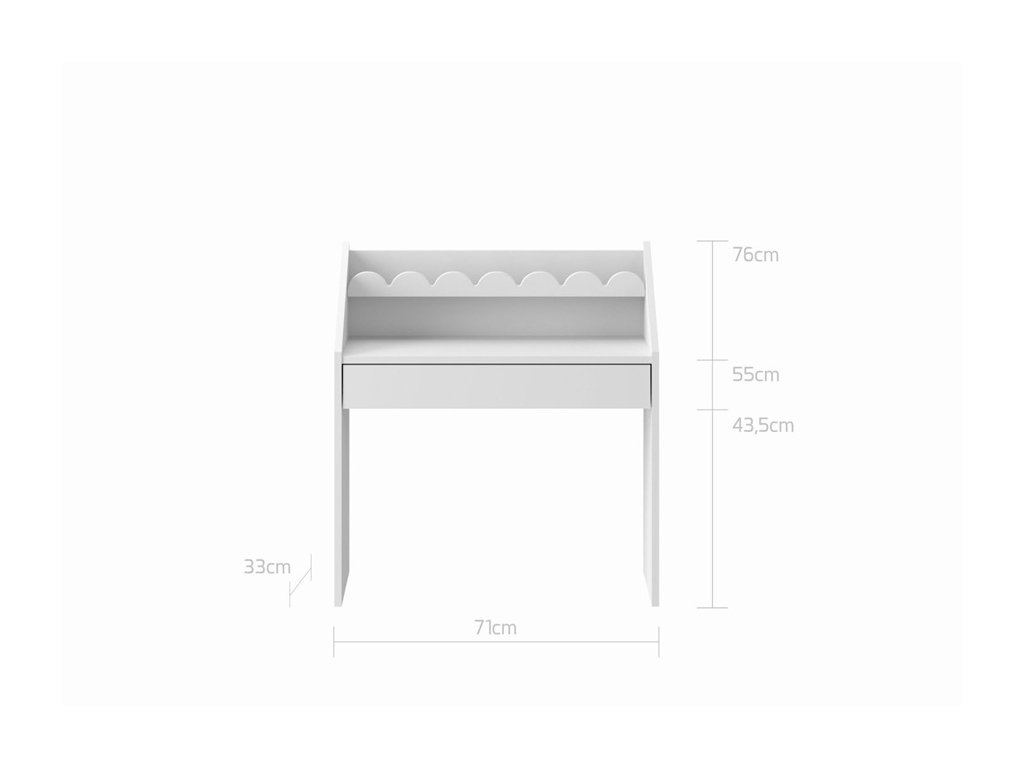 Stůl má úsporné rozměry, takže se perfektně hodí i do malých dětských pokojíčků. Součástí je praktická zásuvka a otevřená polička, které pomáhají udržet přehled a pořádek ve všech drobnostech, pastelkách či knihách.
