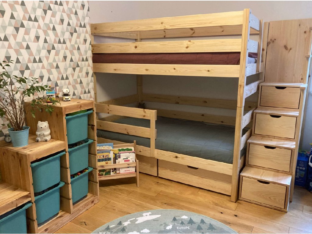 Jemný a univerzální design postele umožňuje doplnění o individuální doplňky, díky nimž se každé patro může stát samostatným útulným prostorem pro vaše dítě. Postel je vyrobena z pečlivě vybraného borovicového dřeva, které bylo důkladně zpracováno zkušenými truhláři s 30letou praxí. Můžete si tak být jisti, že získáváte kvalitní a spolehlivý výrobek.
