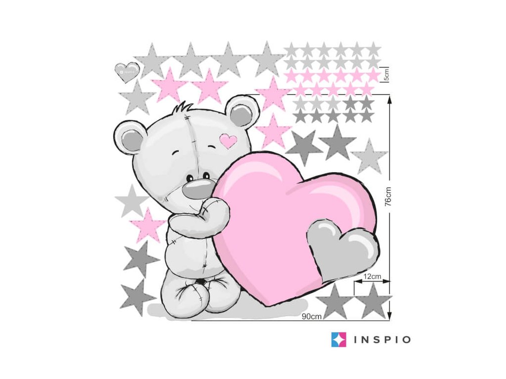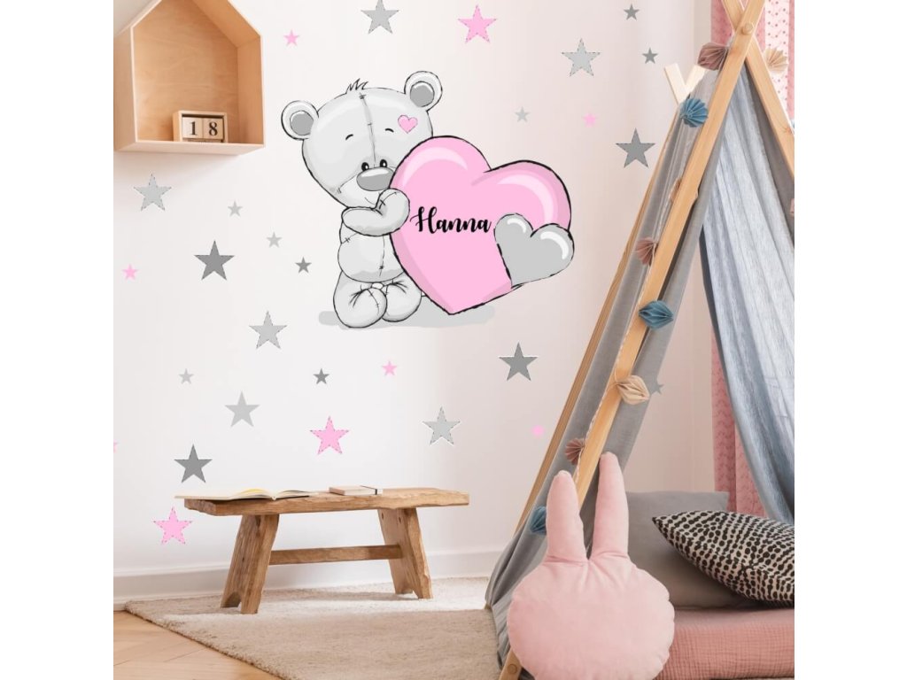 Přelepitelná dětská samolepka na zeď - Medvídek se srdíčkem a jménem