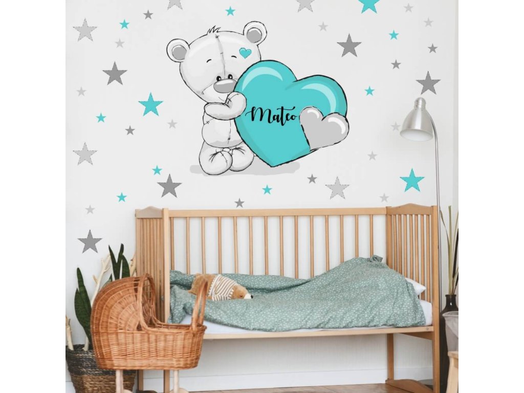 Samolepka na stěnu pro kluka v tyrkysové barvě - Medvídek se jménem