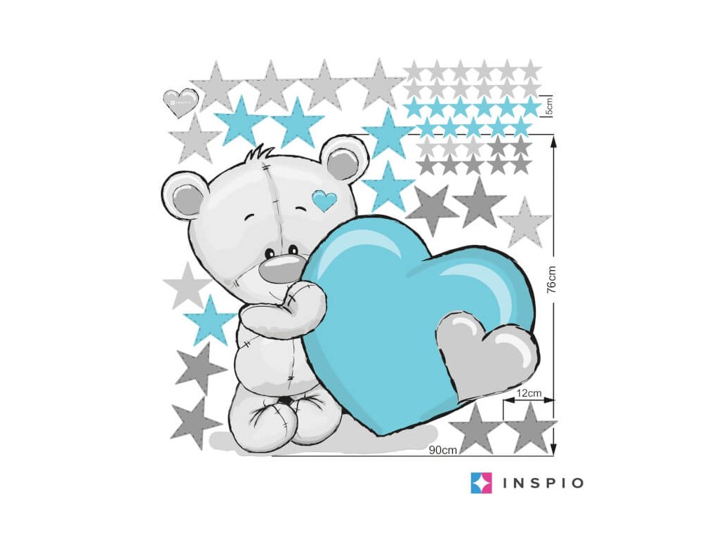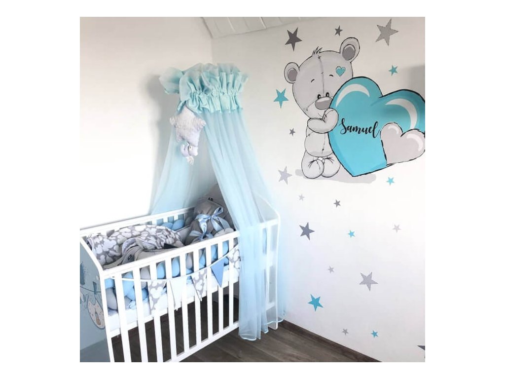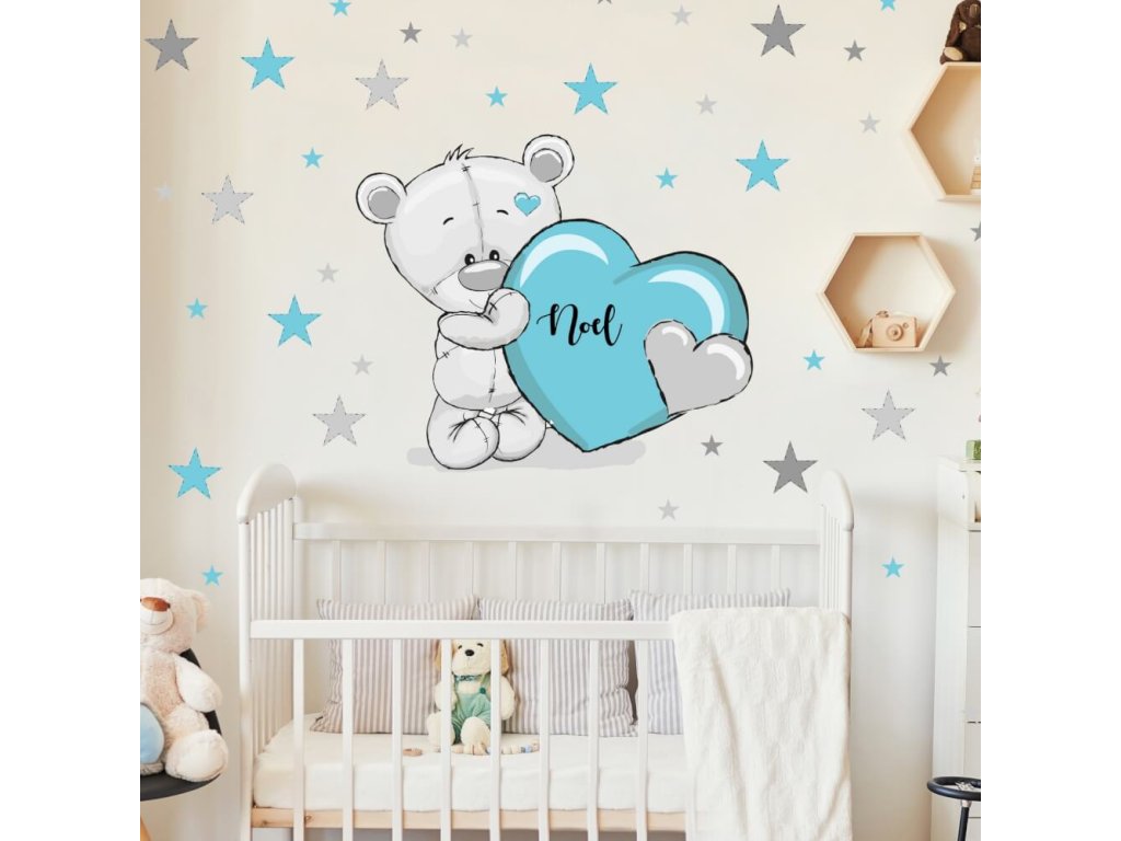 Samolepka nad postýlku - Medvídek s tyrkysovým srdíčkem a jménem